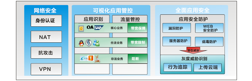 NGAF优秀的应用可视化功能,不但可以识别P2P、IM、视频、炒股软件等互联网应用,满足了普通互联网边界行为管控的要求;同时,还满足了在内网数据中心和广域网边界的部署要求,可以识别LotusNotes、RTX、Oracle EBS、金蝶EAS、SAP、视频等丰富的内网应用,提供更加精细的应用访问权限控制和带宽保障策略,满足内网数据中心和广域网边界的部署要求;此外,为了防止非法外联同时确保服务器得到必要的更新,NGAF还可以准确识别Microsoft、360、Sogou、Kaspersky、金山毒霸等软件更新流量,制定更精细的外联控制策略。