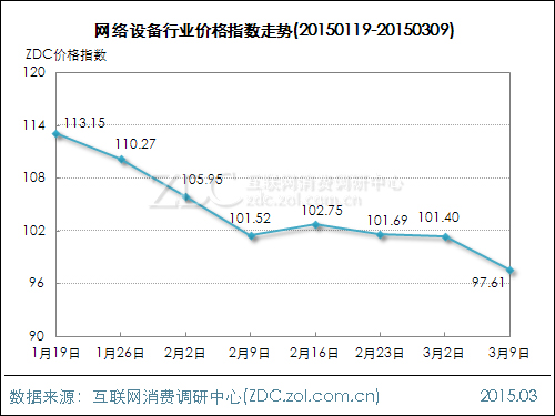 样本说明:本周网络设备行业价格指数走势分析共涉及了服务器、交换机、路由器、无线路由器、无线上网卡、无线网卡六条产品线,统计产品数量共为3204款,其中345款产品加权了京东和亚马逊的价格。涉及厂商数量94家(厂商数量不重复统计)。注:ZDC价格指数是反映中国IT市场价格波动趋势最有影响的指数。该指数于2011年2月21日首次公开发布,基期为2011年1月1日,基期指数定为100。