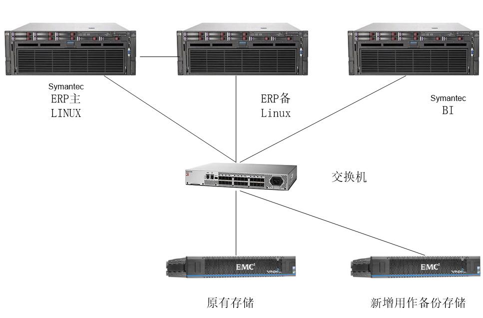 现有生产环境包括三台服务器,两台运行Linux,跑ERP并且利用datebackup,做成双机热备,另外一台服务器运行的是BI系统,现有一台存储(已经有1.8T数据,容量将要用尽),ERP系统和BI应用每天分别大约有300M-400M数据增长。