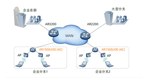 AR2200系列企业路由器集成了AC (Access Controller,无线控制器) 功能, 可对无线局域网中的AP (Access Point,接入点)进行控制 和管理。AR支持丰富的认证方式和 灵活的用户权限控制,能为Wi-Fi用 户提供安全接入保证。同时集丰富 的无线功能于一身,实现对有线无 线一体化网络的集中管理,满足不 同规模企业的建网要求。