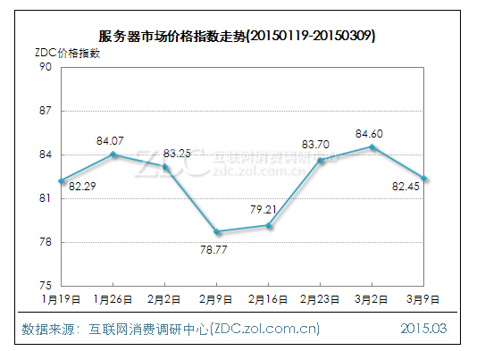 本周服务器价格指数为82.45点,较上周下降2.15点,结束了连续三周的上升走势。整体来看,服务器价格指数在78-85点之间呈波状起伏状态。