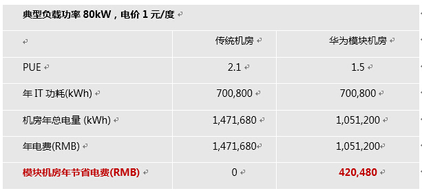 3、绿色节能:PUE值为1.2-1.5,相比传统的机房节能40%以上,长期运营效益可观,符合现在节能减排的主流。下面以本案80KW负载功率为例:(客户全年电费节约42万元)