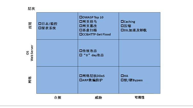 横向:满足合规要求;缓解各类安全威胁(包括网络层面、Web基础架构及Web应用层面);降低服务响应时间、显著改善终端用户体验,优化业务资源和提高应用系统敏捷性。